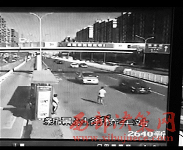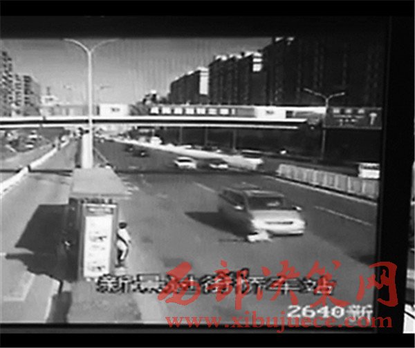 這段不到5秒鐘的視頻翻拍自事發(fā)現(xiàn)場的一個(gè)監(jiān)控?cái)z像頭,視頻正對(duì)的方向是一個(gè)公交站臺(tái)和機(jī)動(dòng)車道。