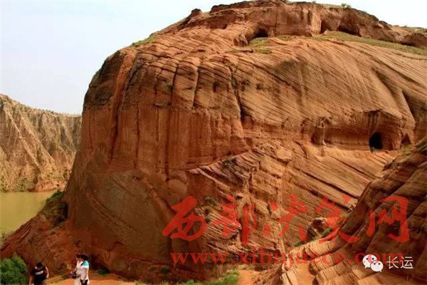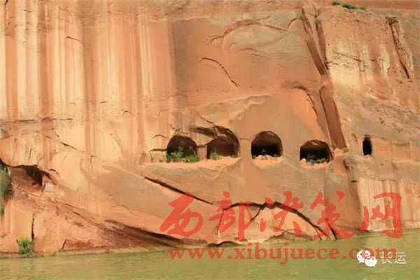 閆寨子,遠(yuǎn)眺是快巨大的紅石頭,巋巍屹立,綠水環(huán)繞,可謂龍洲“赤壁”,離地面百米以上建有窯洞,上下三層,三十多間。
