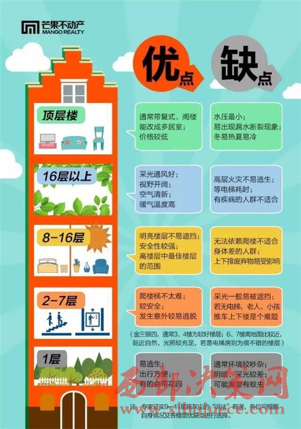 弊:在一些老的小區(qū),高層住宅樓一般水壓較小,有時會出現(xiàn)停水的現(xiàn)象。而且,生火災(zāi)時不易逃生,并且火災(zāi)散發(fā)的有毒氣體都是由下向上擴散的,因此是最危險的樓層。