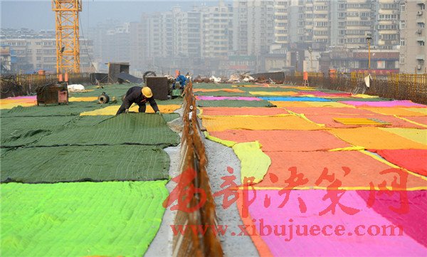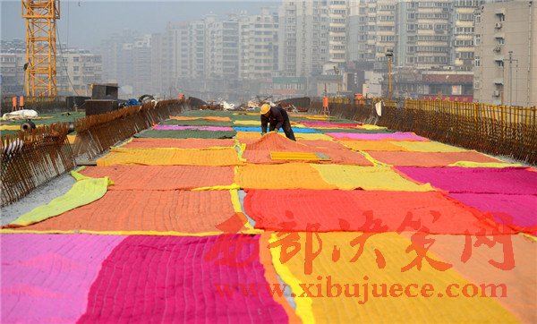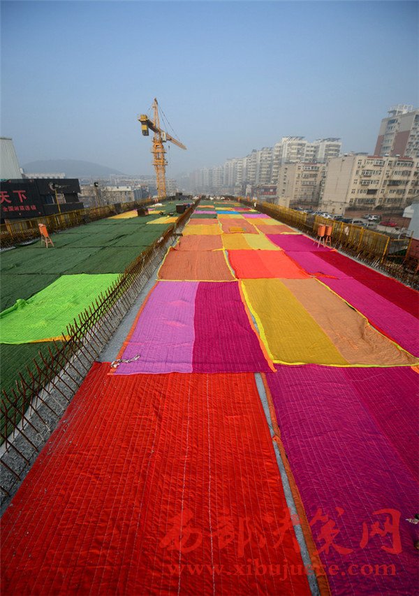 2017年1月2日,濟南,在七里山路附近的順河高架橋南延施工現(xiàn)場,百余米長的高架橋路面鋪設(shè)了彩色的棉被,總數(shù)達(dá)到100多條,覆蓋面積約2000多平方米 。據(jù)了解,該段高架橋為新澆筑的箱梁,為確保冬季低溫下混凝土能夠保證強度和防凍,施工采取多種保暖法,為路面蓋棉被取暖。