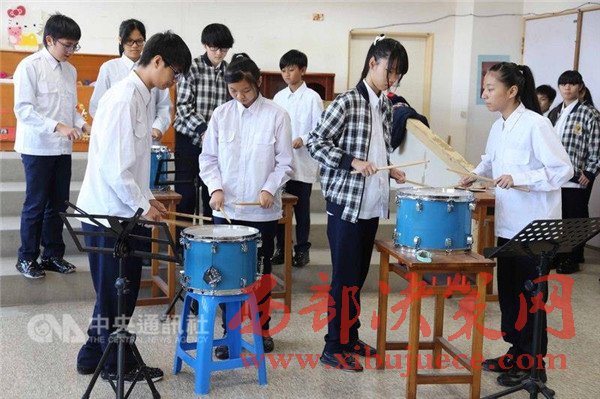 社團(tuán)音樂老師趙純瓏說,打擊樂團(tuán)有16名成員,原本是豎笛社團(tuán),但發(fā)現(xiàn)孩子們經(jīng)常隨著節(jié)奏拍打大腿或拍桌,非?;顫娪志咭魳诽旆?,所以這學(xué)期才成立打擊樂團(tuán)。