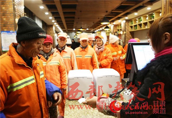19日,蘭州環(huán)衛(wèi)工人以就餐券換餐票。