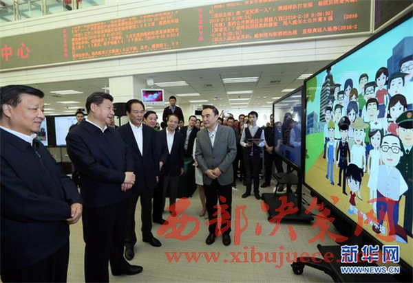 2016年2月19日,中共中央總書記、國家主席、中央軍委主席習(xí)近平在北京主持召開黨的新聞?shì)浾摴ぷ髯剷?huì),并到中央新聞單位調(diào)研。這是習(xí)近平在新華社觀看新聞信息產(chǎn)品展示。新華社記者蘭紅光攝