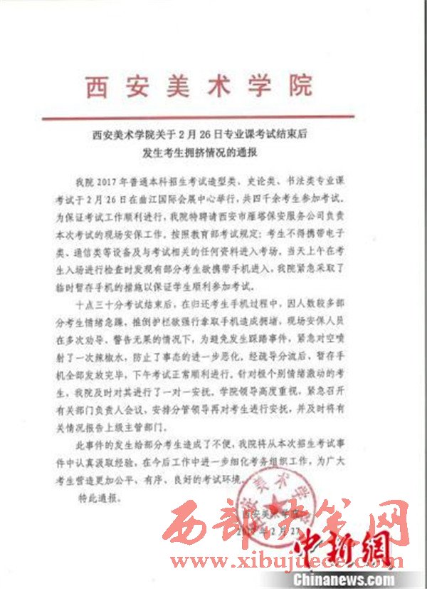西安美術(shù)學(xué)院發(fā)布的事件通報(bào)稱,考試結(jié)束后,在歸還手機(jī)過(guò)程中,因人數(shù)較多部分考生情緒急躁,推倒護(hù)欄欲強(qiáng)行拿取手機(jī)造成擁堵,現(xiàn)場(chǎng)安保人員在多次勸導(dǎo)、警告無(wú)果的情況下,為避免發(fā)生踩踏時(shí)間,緊急對(duì)空噴射了一次辣椒水,防止了事態(tài)的進(jìn)一步惡化。經(jīng)疏導(dǎo)分流后,暫存手機(jī)全部發(fā)放完畢,下午考試順利進(jìn)行。針對(duì)個(gè)別情緒激動(dòng)的考生,該院即使對(duì)其進(jìn)行了一對(duì)一安撫。學(xué)院領(lǐng)導(dǎo)高度重視,緊急召開(kāi)有關(guān)部門負(fù)責(zé)人會(huì)議,安排分管領(lǐng)導(dǎo)再對(duì)考生進(jìn)行安撫,并及時(shí)將有關(guān)情況報(bào)告上級(jí)主管部門。此事件的發(fā)生給部分考生造成了不便,該院將從本次招生考試事件中認(rèn)真汲取經(jīng)驗(yàn),在今后工作中進(jìn)一步細(xì)化考務(wù)組織工作,為廣大考生營(yíng)造更加公平、有序、良好的考試環(huán)境。