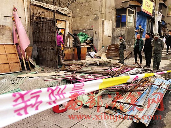 昨日下午5時許,記者在北火巷小區(qū)南口看到,數(shù)名工人正在對沿街違章建筑進行拆除。小區(qū)11號樓一沿街人行道上,拉起有數(shù)十米長的警戒線,警戒線內(nèi)被拆下的防盜網(wǎng)招牌等雜物堆積在一旁等待處理。據(jù)小區(qū)住戶說,該區(qū)域被個別經(jīng)營戶長期“占領”擺攤經(jīng)營的現(xiàn)象終于得到了改善。