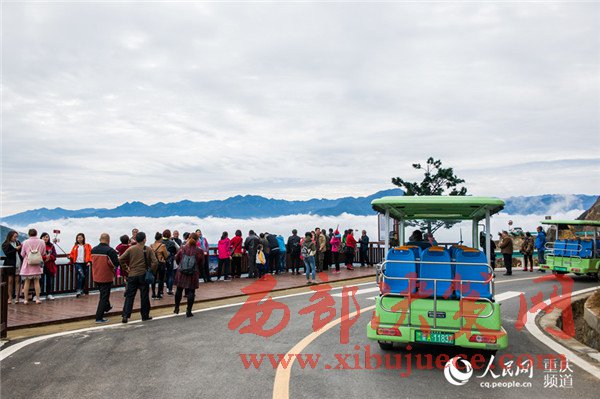 圖為游客在觀景臺觀賞巫山云霧。