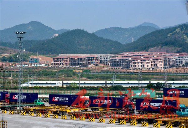 4月15日,浙江義烏西站,集裝箱運輸車準(zhǔn)備進入鐵路口岸。義烏是享譽全球的小商品之都。