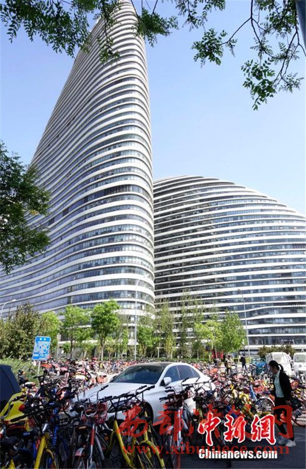 一輛私家車被各家公司、不同顏色的“共享單車”層層包圍。