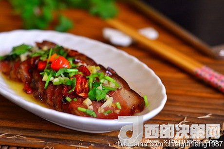 原料:臘肉、朝天椒、花椒、蒜末、香菜。