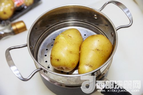 土豆放進入蒸鍋蒸熟(用筷子能輕松插入的程度),晾涼后剝去皮。
