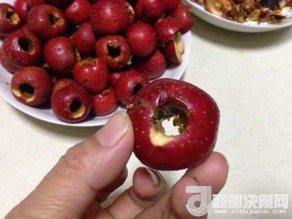 1、用筆桿去核,可以使做出來(lái)的山楂果脯保持完整漂亮的外形。