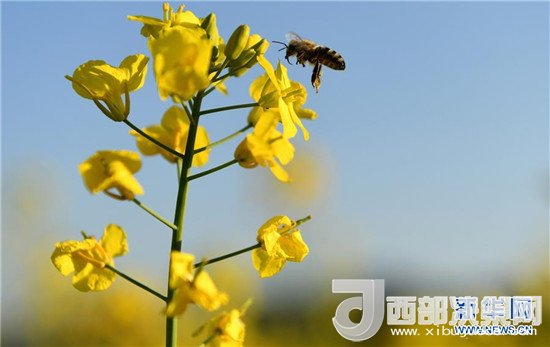 一只蜜蜂在云南省羅平縣盛開的油菜花旁準備采蜜(2月28日攝)。新華社記者 藺以光 攝