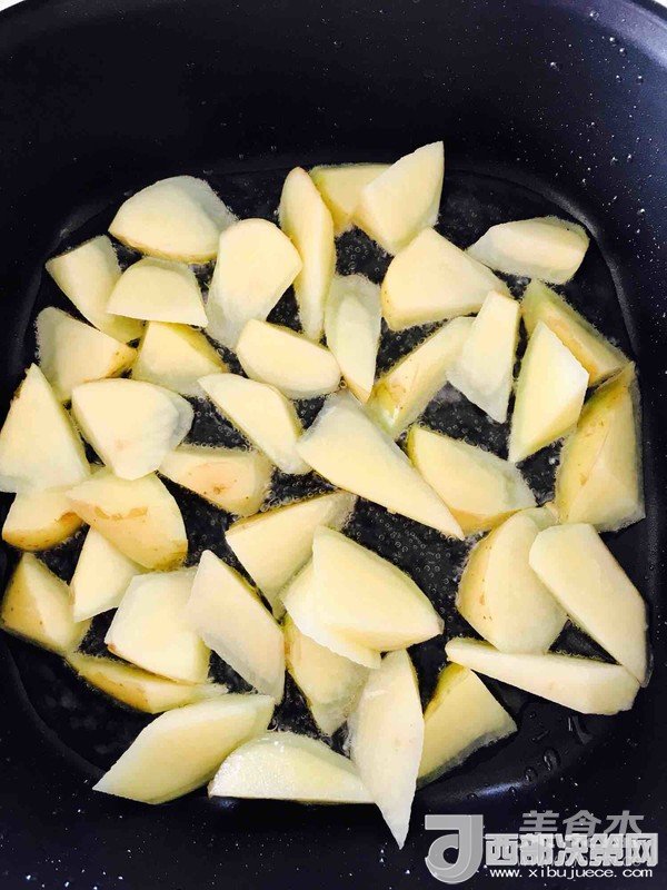 2.開(kāi)小火,鍋中倒入偏多一些的油,油熱下入土豆,小火慢煎。(油能莫過(guò)土豆底層就行)