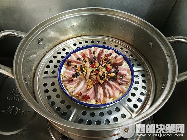 2、蒸制的時(shí)候,千張咸肉中可以加入少許水,我沒有加水,蒸出來稍稍有些干。