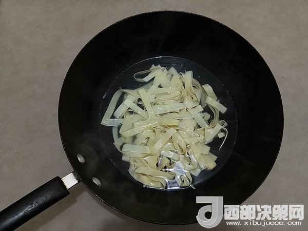 3.千張切寬一些的絲,咸肉用溫水浸泡一會,洗凈切薄片。