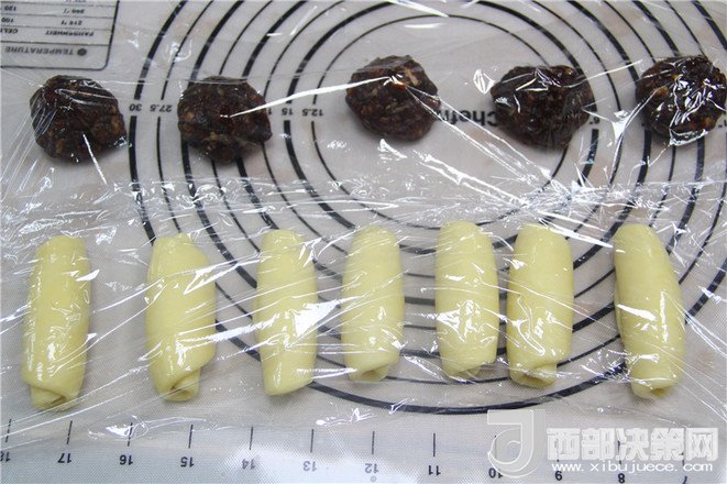 11.把油皮分割成6個(gè)25克,油心分成6個(gè)20克,分別揉成團(tuán)。