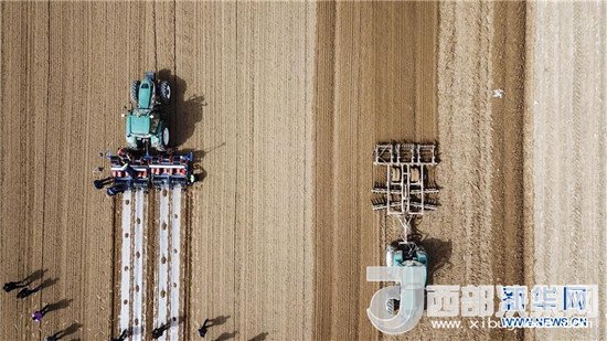 3月23日,“智能拖拉機(jī)”在新疆庫(kù)車縣牙哈鎮(zhèn)的一處棉田中進(jìn)行精細(xì)化作業(yè)(無(wú)人機(jī)拍攝)。新華社記者 胡虎虎 攝