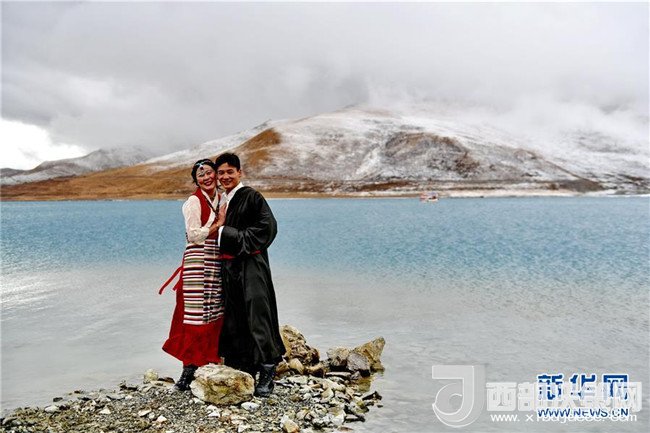 湖畔的牧民和牦牛(4月8日攝)。