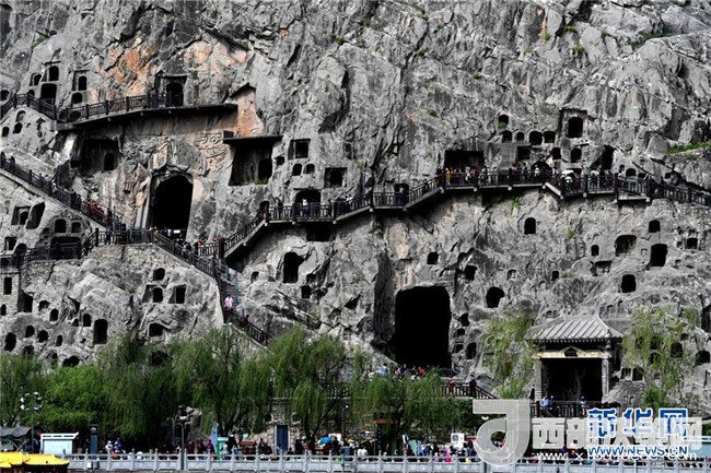 4月11日,游客在河南洛陽(yáng)龍門(mén)石窟景區(qū)參觀游覽。