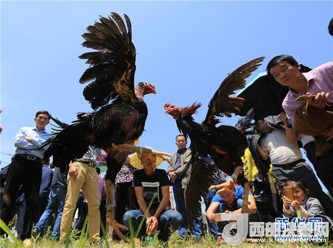 4月18日,在廣西柳州市融水苗族自治縣三防鎮(zhèn),人們在慶祝“三月三”的活動上斗雞。新華社發(fā)(龍濤 攝)