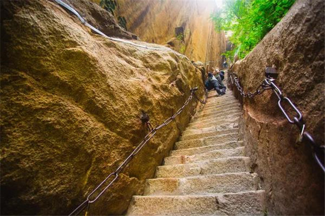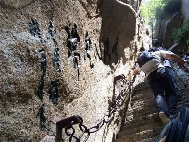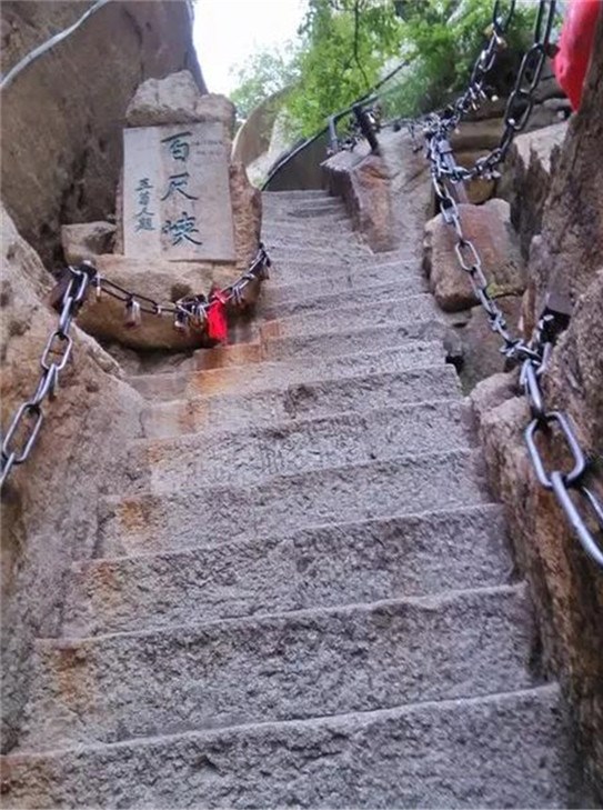 千尺幢位于回心石之上,是華山第一險(xiǎn)境。山幢壁直立,其間僅容二人上下穿行。兩邊鐵鏈垂直下垂,坡度為70°。從上到下共有370多個(gè)臺階,皆不滿足寬。