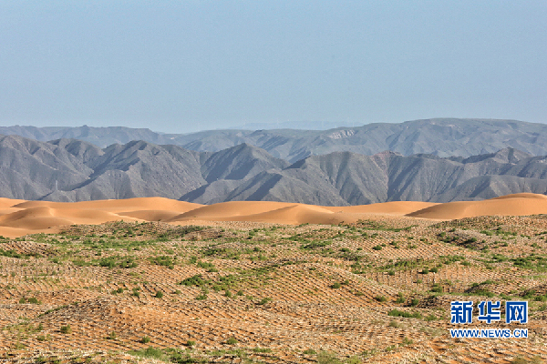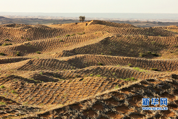 通過“麥草方格”模式組成的“沙帳植物帶”。新華網(wǎng)陳延特攝