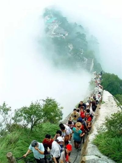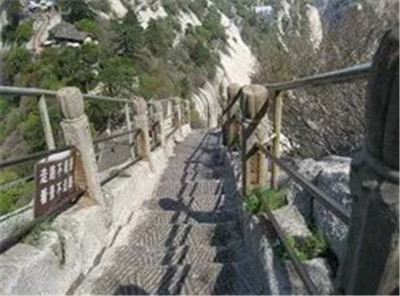 具有700多年歷史的長空棧道,在華山南峰東側(cè)山腰的萬仞絕壁上鑿出來的幾個踏腳之處,鑲嵌石釘搭木椽搭建了一個百余米懸空的棧道,讓人望而卻步,如果你有恐高癥,僅僅看一眼都會讓你驚恐萬分。2013年,著名旅游網(wǎng)站“Smarter Travel”盤點全球最恐怖懸崖步道,將華山長空棧道列為全球十大最恐怖的懸崖步道之一。