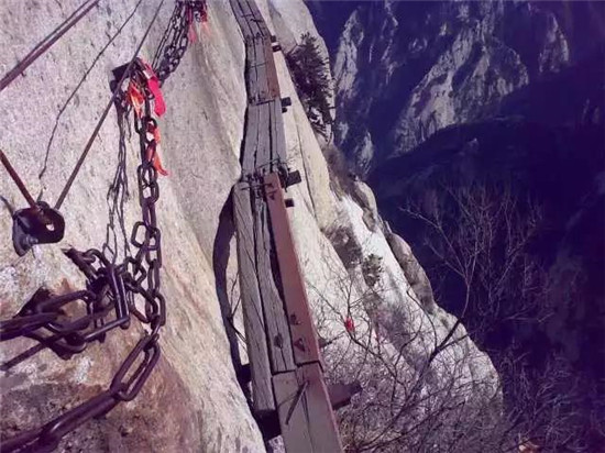 金鎖關(guān):到達(dá)金鎖關(guān)時,眼前大片大片的紅色,游人的視覺和心靈受到強(qiáng)烈的沖擊。這是沿路兩邊鐵鏈上綁滿的密密麻麻的紅色絲繩,不留一絲空隙,風(fēng)吹來,長長的紅色絲繩就輕盈的舞起來,如愛情牢固的臂膀,甜蜜的飛翔在華山之上。讓一把感情鎖和華山一同到地老天荒,成為一個“山無陵,天地絕,乃敢與君絕”的千古情愛神話。