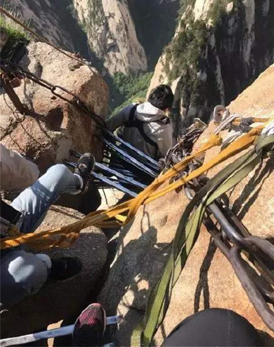 鷂子翻身:這條據(jù)說坡度在120度的懸崖峭壁主要靠臂力,只能用手抓著鐵鏈,腳摸索著探路。人是從上往下攀緣,崖壁往里傾,從上往下望,只有云,只有山峰,什么都不見。這里的可怕在于你不知腳下的路,更無法預(yù)知危險,一不留神就會兩腳懸空,被保險繩吊在空中。