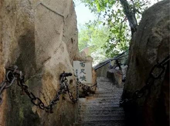 千尺幢:一條陡峭的鳥道從懸崖穿過,僅能容兩人上下,坡度成一條垂直的線,372個臺階向天而上,就像一頭瘦骨嶙峋的老牛的肋骨,承載了數(shù)不清游人沉重的腳步。弓著身子努力向上攀爬的時候,雙手使勁拉住了旁邊的鐵鏈,嘩啦嘩啦的聲音始終在千尺幢這里回響著,除去鐵鏈的聲響,這條鳥道充滿的是小心翼翼的安靜,偶爾有人喊一聲,也是脫口而出的叮嚀和提醒。