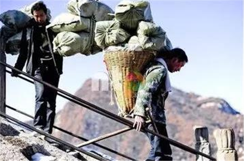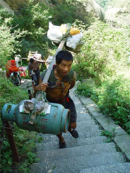 以前爬華山時,碰到的華山挑夫看上去大都三四十歲的樣子,也有年長的,這些人普遍是因?yàn)榧彝ダщy,生活所迫,不得已用肩膀挑起了家里的生活重?fù)?dān)!