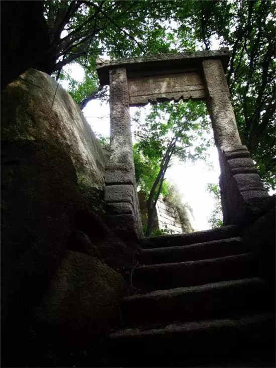 北斗坪上蒼松參天,青竹挺翠,初入有石卷門,稱總天一門。舊時(shí)門前石牌樓有鐵獅一對,分立兩側(cè),獅高數(shù)尺,生動逼真,今移至東道院。過門行數(shù)步,可見兩山環(huán)抱,風(fēng)景宜人,一石坊,額書“紫宸駐蹕”,意為這里是紫微星官居住的地方。