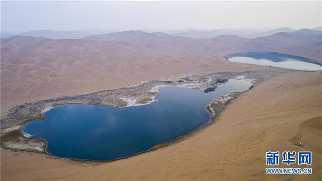 陰雨中的沙漠湖泊,常常讓人以為是一面鏡子(10月18日攝)。 巴丹吉林沙漠位于內蒙古西部阿拉善盟,是中國第三大沙漠,沙丘起伏的曲線陡變成高聳的沙山,碧藍的湖泊散落在沙海間。 新華社記者 李仁虎 攝
