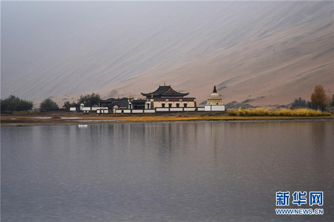 位于沙漠腹地的巴丹吉林廟(10月19日攝)。 巴丹吉林沙漠位于內蒙古西部阿拉善盟,是中國第三大沙漠,沙丘起伏的曲線陡變成高聳的沙山,碧藍的湖泊散落在沙海間。 新華社記者 李仁虎 攝