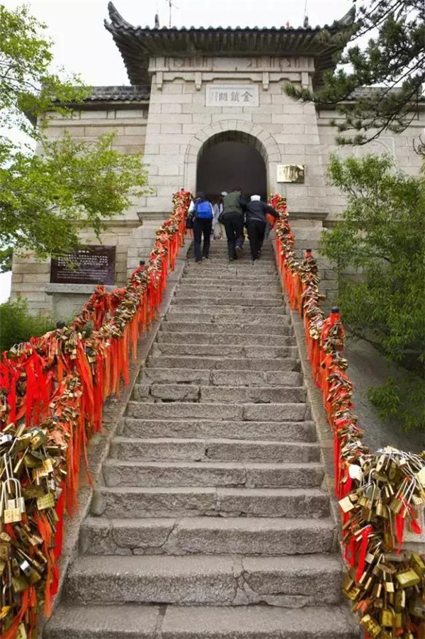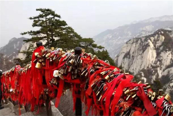 金鎖關北接五云峰,南控華山主峰,東西兩側壑深千丈,關前僅有一米完的臺階石徑。環(huán)周古松蒼翠,奇石林立,常有祥云環(huán)繞,風光非常迤麗。“但有女兒初長成,便為三秦姣姣容。”說的就是奇險天下第一山的華山除了以其奇、險、秀而聞名遐邇之外,還別有一番令人動容的金鎖關風景:關內、關外登山路兩側的鐵索上,情侶鎖、平安鎖,重重疊疊,紅繩彩線迎風搖曳,筑成一道美麗的愛情風景線,鎖住對愛情的誓言,表達堅如磐石的愛情忠貞!