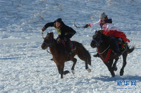 11月17日,當?shù)鼐用裨谘┑厣线M行賽馬比賽。當日,新疆那拉提冰雪旅游文化節(jié)在新疆新源縣那拉提旅游風景區(qū)開幕。此次冰雪節(jié)將舉辦滑雪運動會、雪地越野跑、雪地足球、雪地摔跤等活動,為游客帶來冰雪之樂。 新華社發(fā)(丁磊 攝)