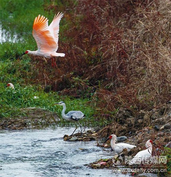 11月21日,幾只朱鹮在洋縣龍亭鎮(zhèn)的一處小河邊覓食。