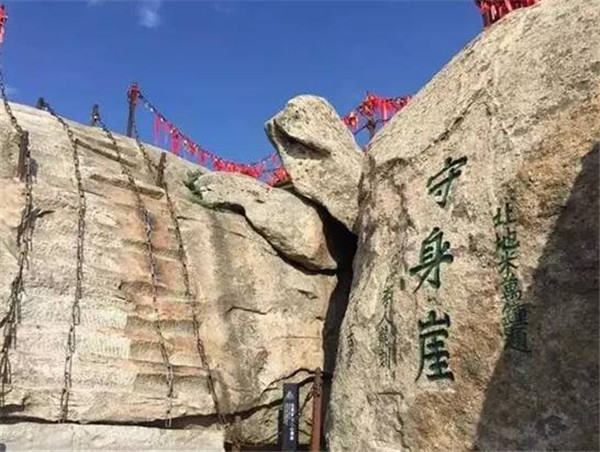 位于華山西峰頂摘星石北。民間傳說古時(shí)有個(gè)孝子,雙親身染重疾,久治不愈,聽說岳神靈驗(yàn),便登山拜神求醫(yī)。在向岳神祈禱的過程中,孝子許愿說只要雙親病愈,愿舍去自己的性命來報(bào)答神靈。果然,當(dāng)孝子返回家中時(shí),父母都已康復(fù),且已下田耕作去了。孝子還愿來到華山,毫不猶豫的從此處跳下深淵,可他卻覺得身體若有人托起,似乘長(zhǎng)風(fēng),飄飄欲仙。待清醒時(shí),原來依然躺在家中,似夢(mèng)非夢(mèng)。孝子知道是華山神暗中相助,便告別父母到華山西峰作了道士。后人被孝子的誠(chéng)心感動(dòng),就將此處命名為舍身崖。 清道光年間李榕的伯祖李仁龍為阻止后人仿效孝子的行為,改舍身崖為省身崖,以警示忤逆之街徒游到這里時(shí)應(yīng)對(duì)照孝子,自警自省,痛改前非。后來又有人認(rèn)為舍身救雙親的行為并不可取,也稱崖作守身崖,以教育后人生命可貴,不可輕擲。
