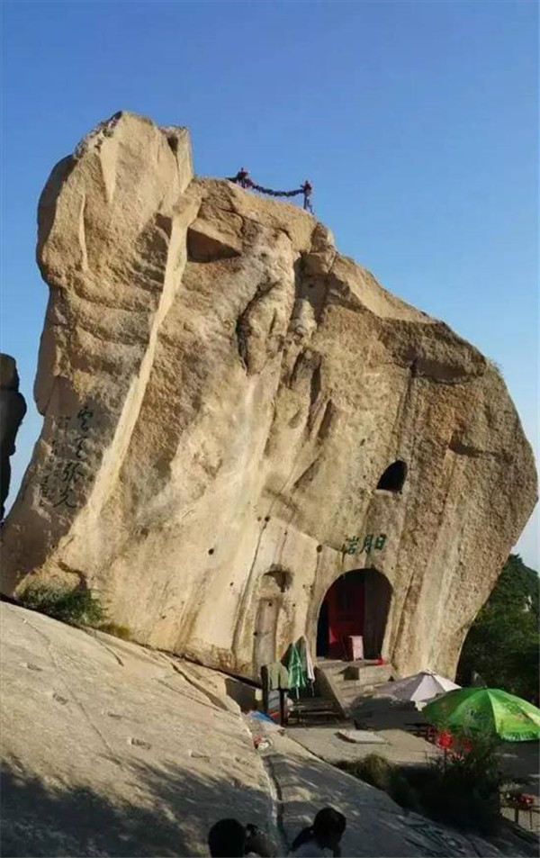 看過金庸武俠小說的童鞋們,一定聽過全真教。那么全真崖呢?它位于南天門西,為松檜峰頂向南懸空傾伸之崖石。出南天門越長(zhǎng)空棧道可至崖下。崖腹部有賀老石室,是元初道士賀志真開辟的修行之地?!赌戏逵洝分杏浭觯?ldquo;巖類俯首形,遙覆室上,上書“全真巖”三字,赤色以實(shí)之。雖知人所為,然上不可下,下不可上,其履虛而作之邪?何其神也!”