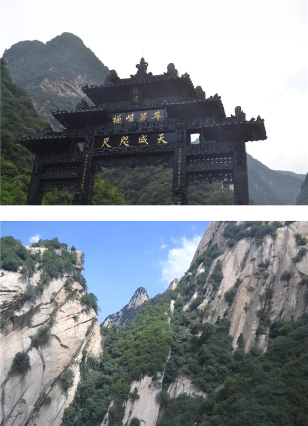 往西可去往中峰,往南可順原路返回,因暴雨如注,只得放棄攀爬中峰。順原路經鷂子翻身,孩子仍念念不忘:“媽媽,這會兒大暴雨,肯定沒人排隊,咱們去翻鷂子翻身!”聽了孩子“初生牛犢不畏虎”的話,我不由哈哈大笑:“小傻瓜!這么大的暴雨,有誰去翻鷂子翻身呢?不要命啦?”在鷂子翻身入口處,孩子還是萬般眷戀地探身查看,當看到還未來得及撤離的人員身系保險繩懸掛在峭壁上,就像風雨中掉著蛛絲的蜘蛛,被風雨襲擊的無處藏身、進退兩難,方才知道了害怕。