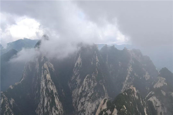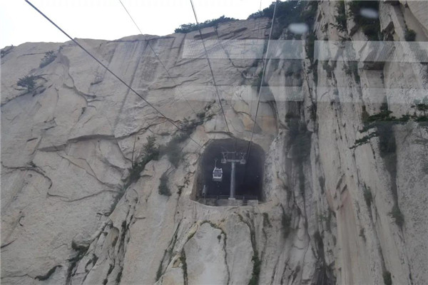 現(xiàn)在爬華山可不是“自古華山一條道”了,我們選擇坐西峰索道纜車,凌空飛渡千山萬壑。說是千山萬壑,其實華山是由一塊完整碩大的花崗巖石體構成的。《山海經》記載:“太華之山,削成而四方,其高五千仞,其廣十里。”真的很難想像,這么連綿起伏、巨大的山體,其實是一個群峰競秀的整體。華山,就是這么神奇!