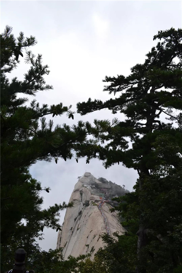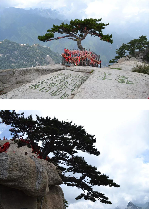 經煉丹爐、孝子峰,云霧悄悄退隱,我們向南峰頂挺進。南峰蒼翠秀麗,沿途的華山松千姿百態(tài),引人注目。華山迎客松生長于懸崖峭壁的石縫中,向懸崖一側伸出虬勁的枝干,就像好客的秦人伸出有力的大手歡迎遠道而來的客人。虬枝龍形的枝干上,是綠意盎然的松針,根根好像要刺破天穹。華山迎客松在藍天白云的映襯下,仿如碧玉雕琢而成,綠的耀眼,秀挺卓然!