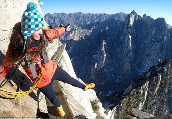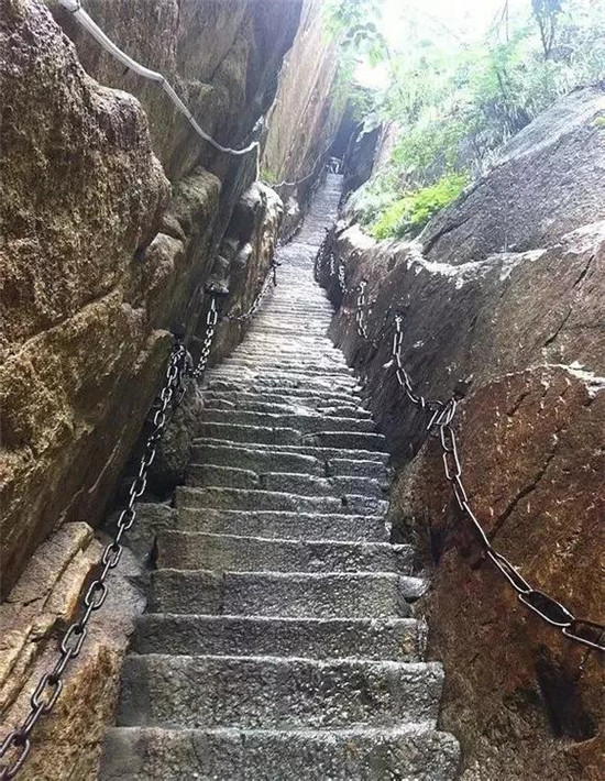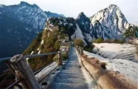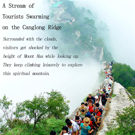 這是一個(gè)溫暖的美麗秋天,華山壯觀的峭壁在陽(yáng)光下閃閃發(fā)亮,稀有樹木炫耀著多彩的秋葉,遠(yuǎn)方跳躍的瀑布吸引著游客的眼球,奇形怪狀的點(diǎn)點(diǎn)白云在腳下緩緩流動(dòng)。我和我的朋友開始了一場(chǎng)艱苦的旅行,一起攀登6,600多級(jí)鑿在巖石上的臺(tái)階,目標(biāo)是海拔2154.9米南峰之巔祭祀華山神的道觀?! ?