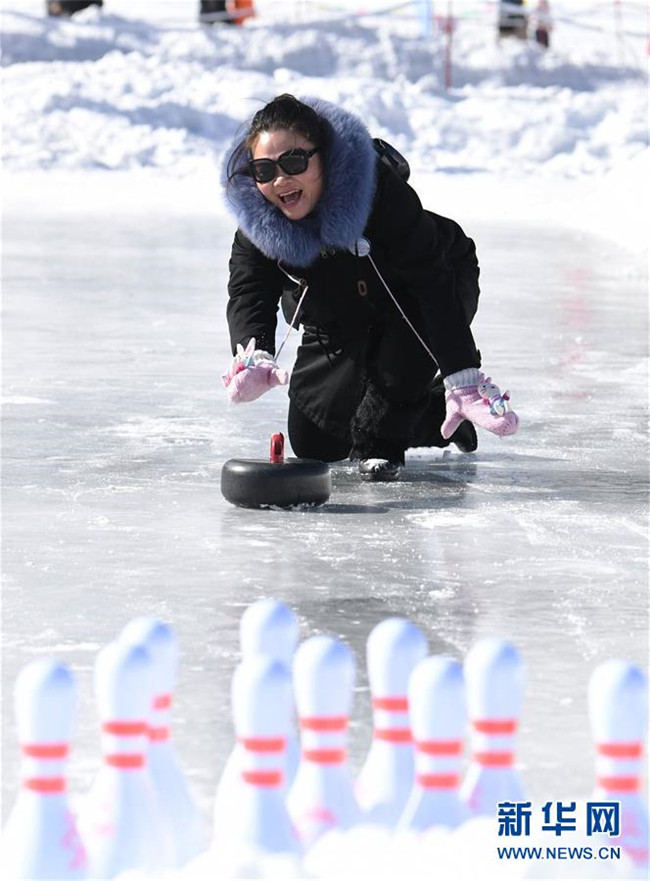 2月17日,一名游客在新疆天池景區(qū)玩冰上保齡球。 2018年入冬至2019年2月17日,新疆天池景區(qū)接待游客23萬人次,實現(xiàn)旅游經(jīng)濟收入2.25億元。新疆天池景區(qū)著力發(fā)展冬季旅游,為游客提供優(yōu)質(zhì)冰雪旅游體驗,逐漸將天池“冷資源”變成“熱經(jīng)濟”。 新華社記者沙達提攝