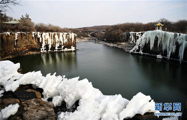 去冬今春以來,黑龍江省鏡泊湖的吊水樓冰瀑景色壯觀,吸引許多游人前來觀賞。 新華社記者 王建威 攝