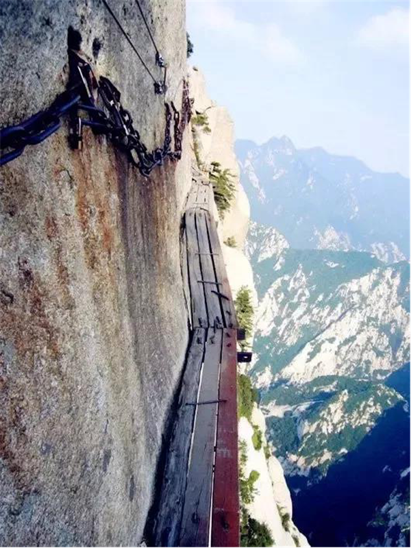 我站在華山兩塊窄窄的木板上,依靠鐵釘楔入巖石作為支撐,我的腳下,是1000米的深谷,冰雪的路面很滑。我來華山旅游純粹是因為在互聯(lián)網(wǎng)上瘋傳的一張圖片,也就是指“世界上最危險的登山路”那張。現(xiàn)在有了安全保護措施,實際上用不著擔(dān)心危險了。恐懼慢慢涌上心頭,頭腦變得有些麻木。西安是中國的古城,在強盛朝代時期占有重要的歷史地位。