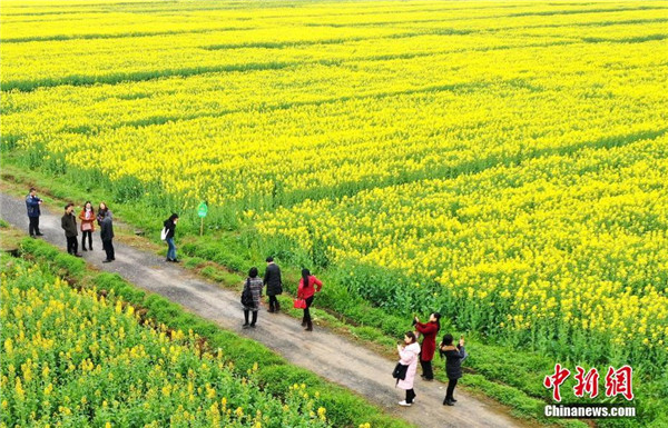 3月2日,江西省吉水縣烏江鎮(zhèn)楓坪千畝油菜花基地油菜花盛開(kāi),許多游客前來(lái)觀賞拍照徜徉在花海中。郭弘毅 攝