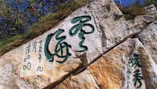 在蒼龍嶺上方平臺邊崖上刻有“云海”二字,落款就是“OO”題,不知“OO”是什么字?有人說是“昌”“明”二字,有人說是陜西關(guān)中方言“jiao”(意思就是太陽光很火辣),到底是什么字,至今既無稽可考,也無典可查,成為一大字謎。