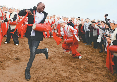 在陜西延安安塞區(qū)南溝進(jìn)行的一場(chǎng)腰鼓演出結(jié)束后,一名外國(guó)游客與當(dāng)?shù)匮氖止餐蚱鹆搜?。新華社記者 劉 瀟攝