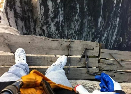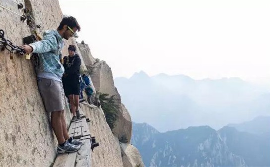 譯:不會有問題吧?游客攀登數(shù)千英尺高的中國名山,到達700年前修建的木棧道上。